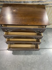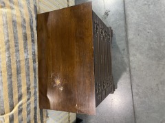 This has some scratches and discoloration. It measures 24 inches tall, 24 inches wide, and 15 inches deep. All items purchased online are eligible for a full refund before they leave the store.